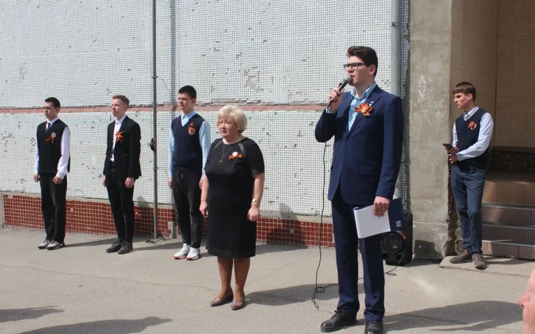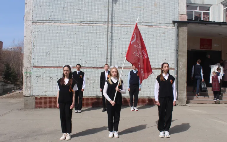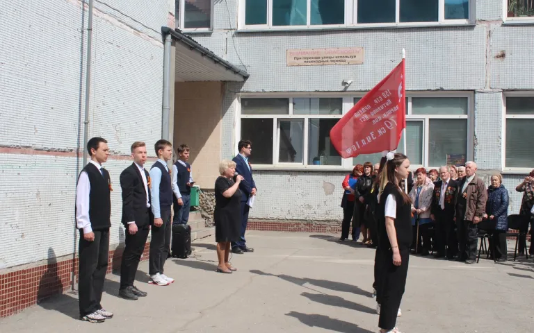 Члены церемониальной группы, активисты ТОС под руководством Сергея Денисова, начальника караула подняли государственный флаг над зданием школы, торжественно вынесли копию Знамени Победы, исполнили гимн Российской Федерации.