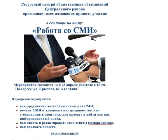 Ресурсный центр общественных объединений Центрального района приглашает всех желающих принять участие в семинаре на тему: «Работа со СМИ».