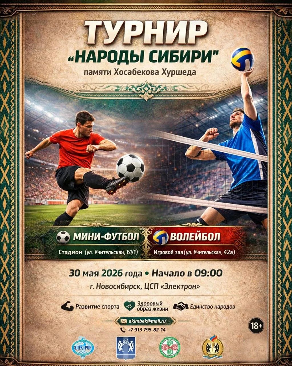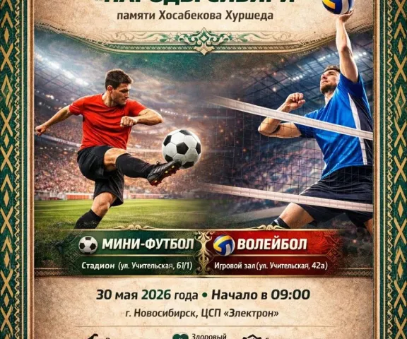 30.05.2026 в Новосибирске на базе ЦСП «Электрон» пройдут Турниры «Народы Сибири» по мини-футболу и волейболу, посвященные памяти Хосабекова Хуршеда, погибшего при исполнении воинского долга в ходе специальной военной операции