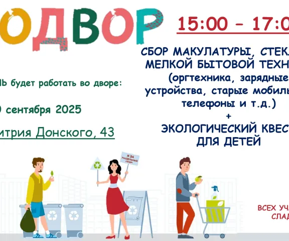 30 сентября 2025 года с 15:00 до 17:00 планируется проведение эколого-просветительской акции «Экодвор» в благоустроенном дворе города Новосибирска по адресу: ул. Дмитрия Донского, 43.