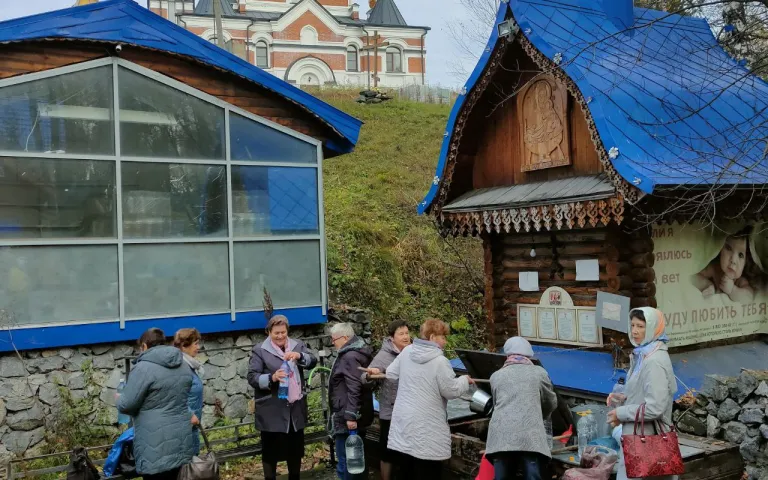 Спустившись по ступеням вниз и пройдя по мостику, можно испить святой воды и набрать с собой. Вода удивительна тем, что в ней нет железа - это редкость для Новосибирской области. Святая вода обладает превосходным вкусом и свежим запахом. Пить ее можно сколько угодно. Святой источник не замерзает даже зимой.
