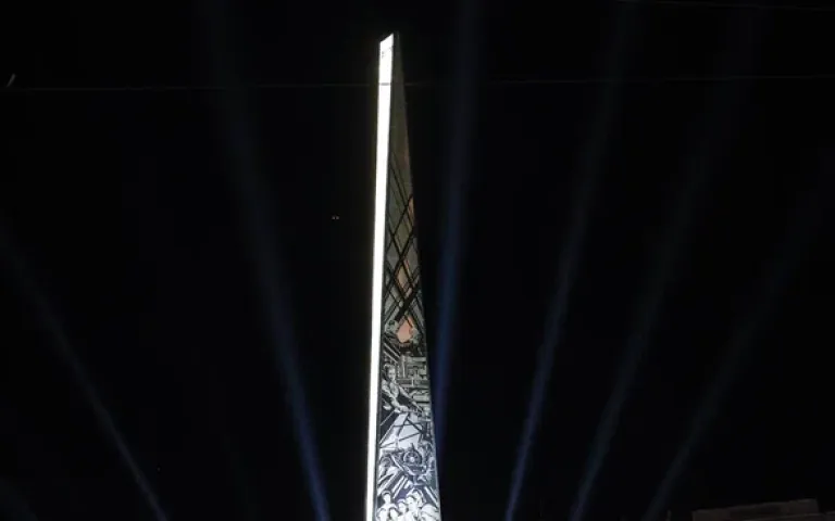 Высота стелы от уровня проезжей части - 35 метров. Общий вес стелы — около 40 тонн.