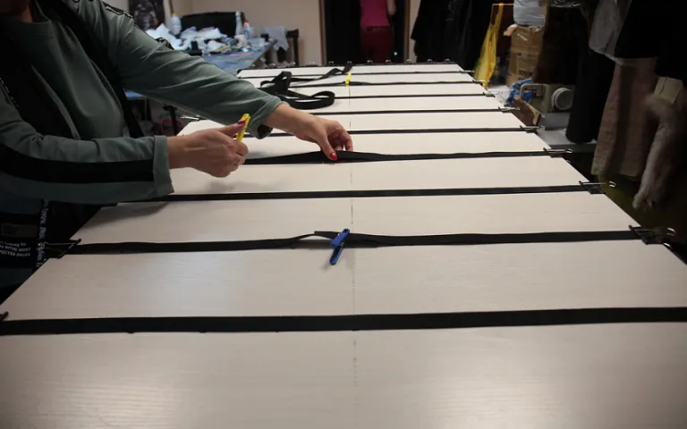 На длинном столе готовят ткань, из которой будут кроить футболки. Расцветка «пиксели» соответствует ситуации. Никаких тебе ромашек и мишек.