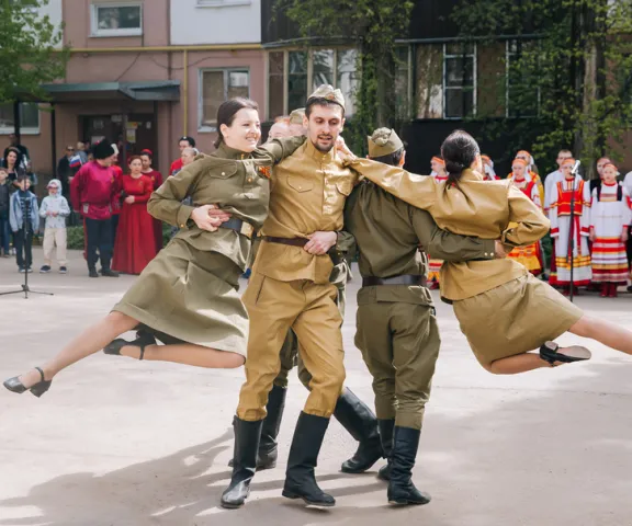 Ветеранов Великой Отечественной войны поздравляют с Днём Победы в Новосибирске. Во дворы фронтовиков привозят концерты. В поздравлении принимают участие курсанты военного института — духовой оркестр играет знакомые мелодии, а знамённая группа проходит маршем с государственным флагом Российской Федерации, отдавая честь героям.