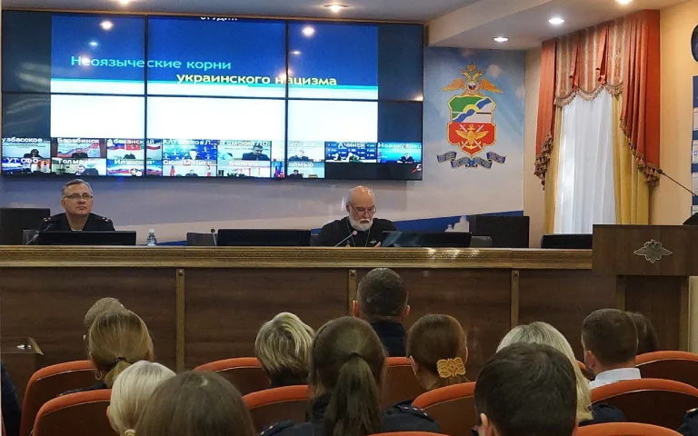 Отец Александр - член Общественного совета УТ МВД РФ по СФО и межведомственной комиссии мэрии г. Новосибирска по профилактике экстремизма и терроризма, прочитал лекцию на тему «Неоязыческие корни украинского нацизма». Слушателями являлись сотрудники Управления и в Новосибирске, и во всех региональных филиалах СФО, для которых была организована интернет-трансляция. Отец Александр рассказал как неоязычество используется нацистской киевской властью для укрепления своей позиции; о том, как нацизм находит мотивацию в неоязыческих ритуалах, культах и использует их как формы выражения и демонстрации своей идеологии; о том, как киевская нацистская власть укрепляется благодаря самым разным сектантским движениям, которые являются ее естественным союзником в разрушении исторической памяти народа и в насаждении агрессивной русофобии. Подмена реальных истории и традиций неоязыческими подделками растут на невежестве и незнании своей подлинной религиозной традиции, и это характерно не только для украинских, но и для отечественных неоязычников. Неоязычники являются не продолжателями традиций и религии древних славян, но продолжателями традиций и оккультной идеологии Третьего Рейха, что проявляется у них во всём - от носимой символики эсэсовских военных формирований и нацистских приветствий, активно демонстрируемых на камеру, до вытатуированных рун и свастик, и ненависти к христианству. Особо отец Александр отметил роль США в использовании против других государств сект вообще, и неоязыческих - в частности: в 1998 году американцами был принят «Закон о международной свободе вероисповедания», согласно которому любое противостояние сектам в неугодных странах немедленно объявляется «серьёзным нарушением свободы вероисповедания», что является поводом для оказания политического и экономического давления на эти страны. Наглядными результатами использования сект на Украине являются майдан 2004 года, в результате которого к власти там пришёл Ющенко, и майдан 2014, закончившийся государственным переворотом с приходом к власти откровенных нацистов и к началу так называемой «АТО на Востоке Украины», в процессе чего были сформированы многочисленные «нацбаты», среди которых наиболее известный - признанный террористической организацией «Азов». Учитывая активное стремление адептов неоязычества к проникновению в правоохранительные структуры и вооруженные силы, следует понимать всю опасность этого явления для нашего государства, и активно противодействовать ему. Важность этого нашла отражение и в обновлённой Стратегии противодействия экстремизму в Российской Федерации, подписанной Президентом 28 декабря 2024 года. По окончанию лекции отец Александр ответил на вопросы слушателей.