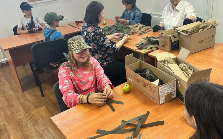 Патриотическое воспитание продолжилось связыванием «паучков» и плетением маскировочных сетей совместно с активистами серебряного возраста принимающих участие в помощи солдатам СВО.