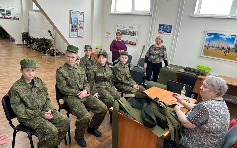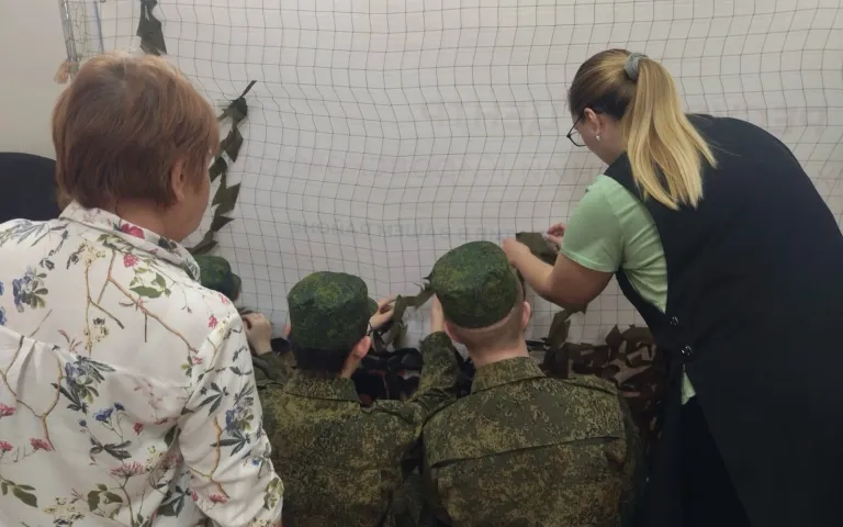 Члены инициативной группы ТОС «Матрёшкин двор» и АНО «Сибирская поддержка» обучали учащихся школы №217 - участников движения «Юнармия» изготовлению маскировочных сетей от начала и до конца. Перед началом плетения председатель ТОС «Матрёшкин двор» Виктория Вагнер и специалист по связям с общественностью ресурсного центра Васильева Е.В. рассказали насколько необходимы и важны маскировочные сети для военнослужащих и для чего они применяются.