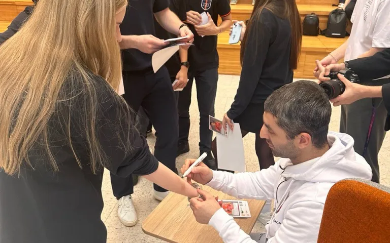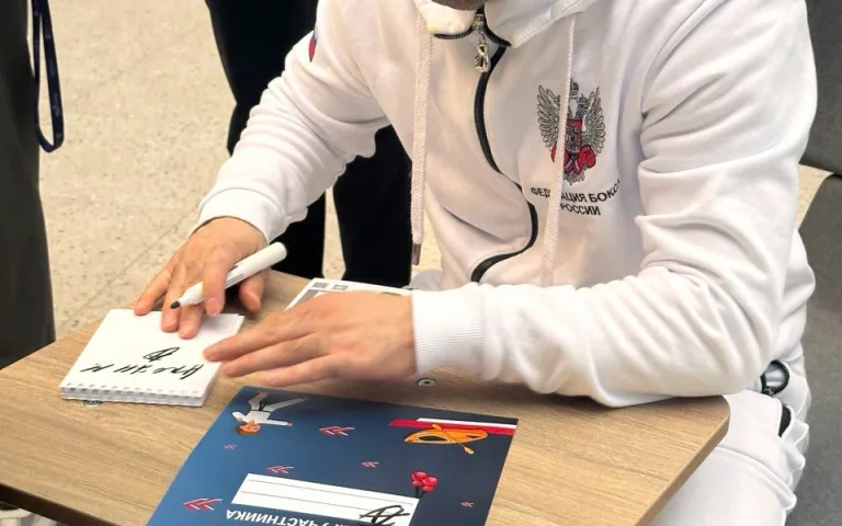 Чемпион поделился своей историей успеха, ответил на вопросы учеников, провел мастер-класс по боксу и раздал на память автографы.