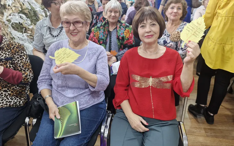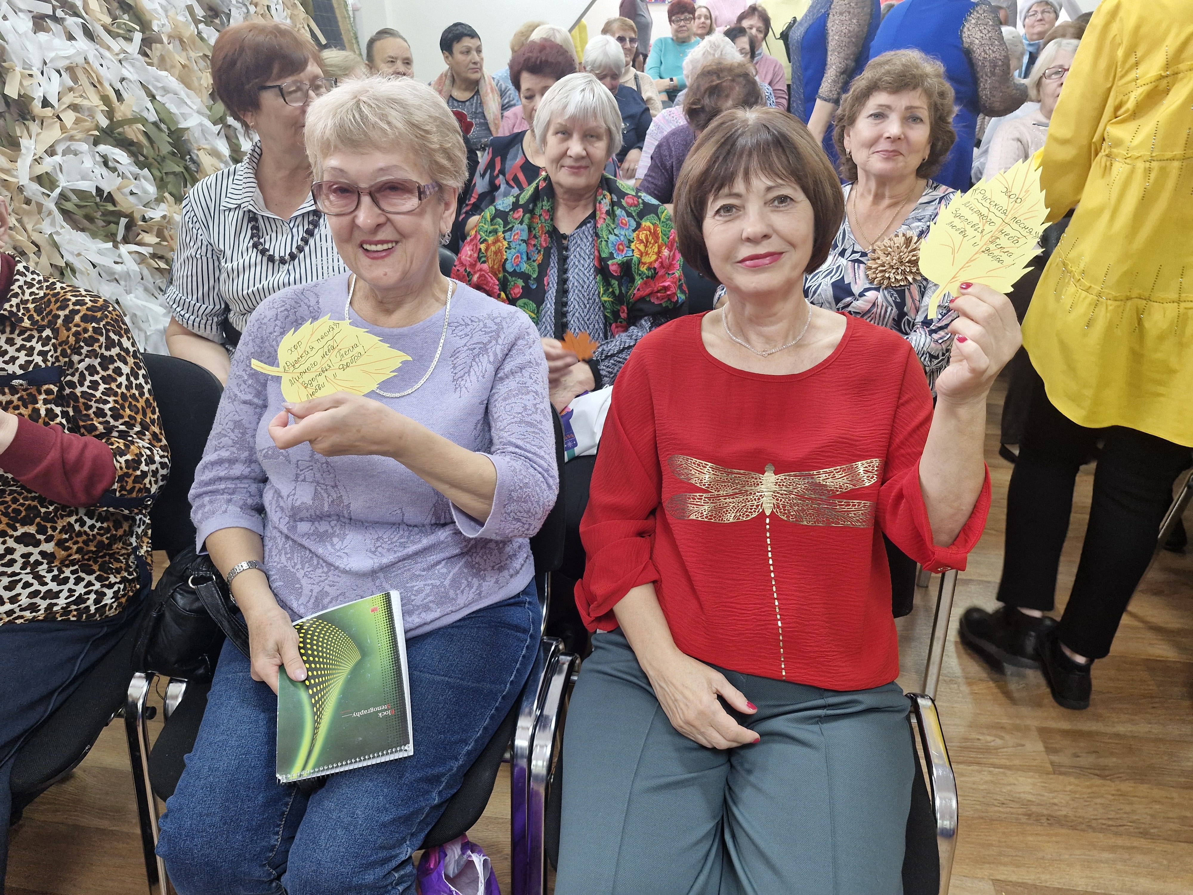 Это был настоящий праздник души! Звучали любимые с детства песни: от «У природы нет плохой погоды» и «Рябиновых бус» до «Мои года — моё богатство». Не обошлось без веселых частушек, стихов и сценки. А в финале каждого зрителя ждал милый и трогательный сюрприз — листочек – символ осени с добрым пожеланием.