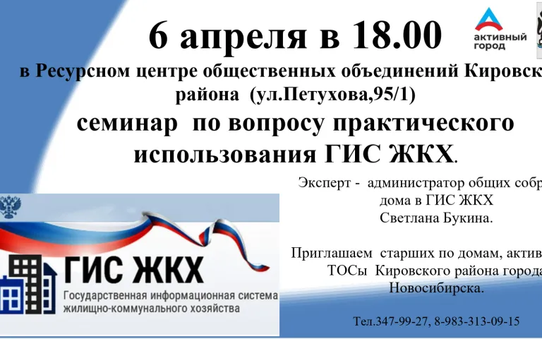 6 апреля 2023 года в 18.00 в Ресурсном центре общественных объединений Кировского района ул.Петухова,95/1 состоится обучающий семинар по вопросу практического использования государственной информационной системы ГИС ЖКХ для старших по домам, активистов ТОС и общественности Кировского района.