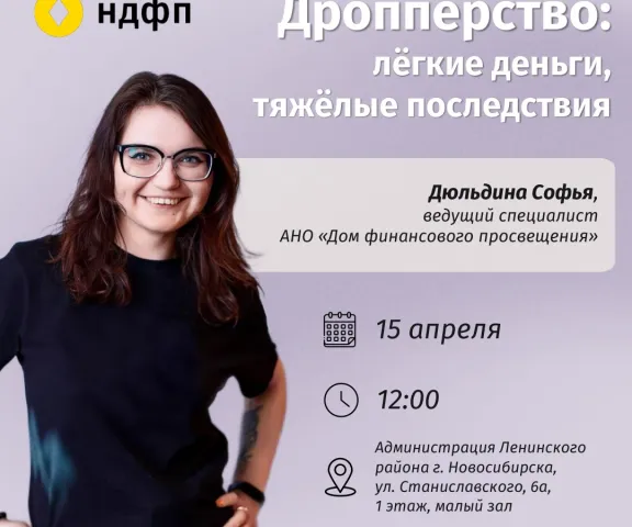 Приглашаем вас на важную лекцию «Дропперство: легкие деньги, тяжелые последствия» от ведущего специалиста АНО «Дом финансового просвещения» - Дюльдиной Софьи Андреевны.