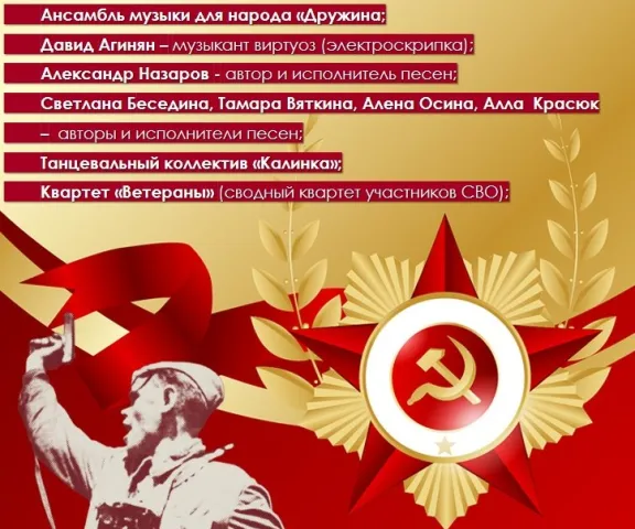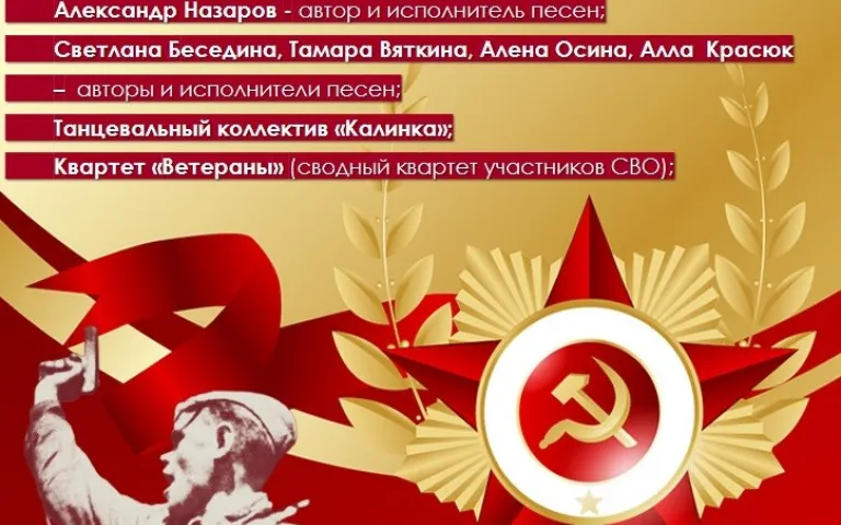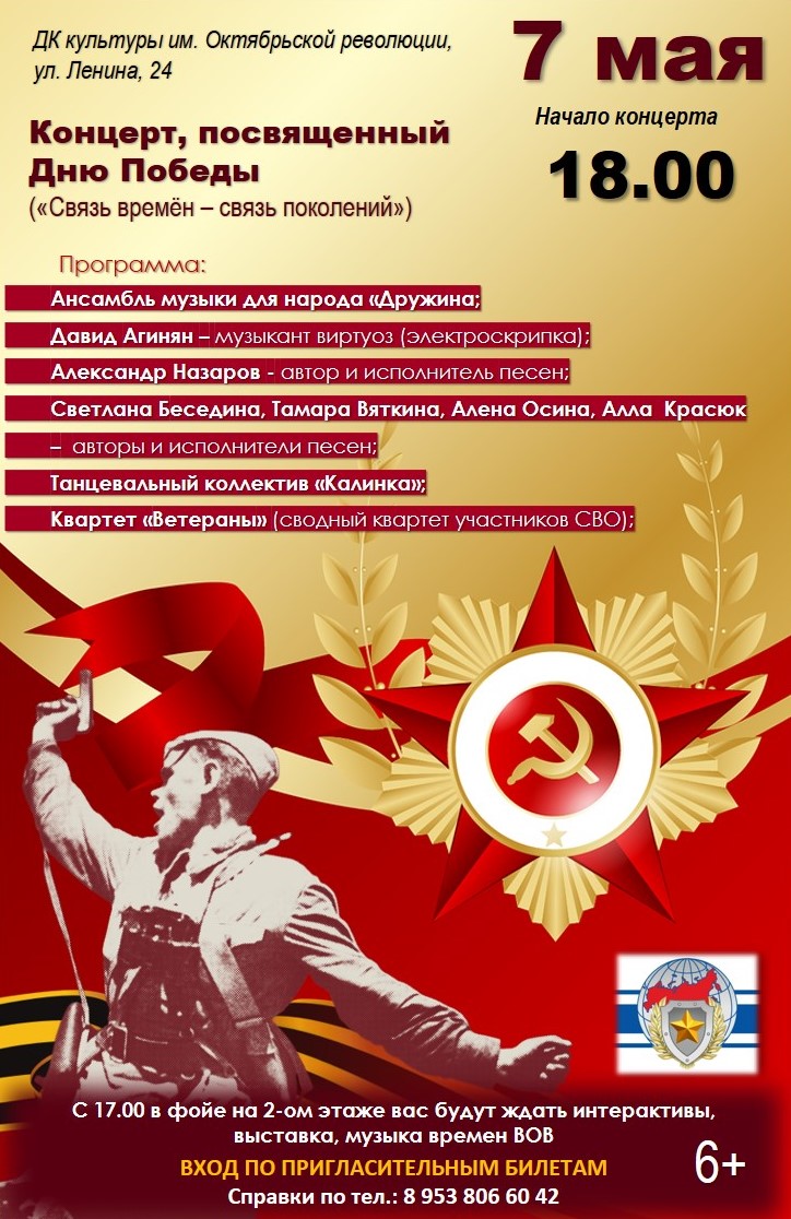 7 мая в 18:00 приглашаем вас на торжественный концерт, посвящённый Дню Победы! Это будет незабываемое событие, наполненное гордостью и уважением к нашим героям.
