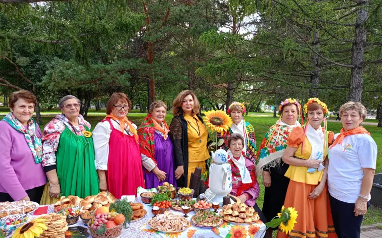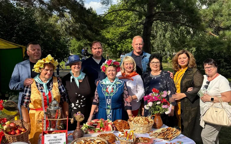 На центральной аллее при входе гостей встречали столы с угощениями от организаций ТОС, постаравшихся и украсивших свои стенды не только выпечкой, но и поделками, дарами этого дачного сезона.