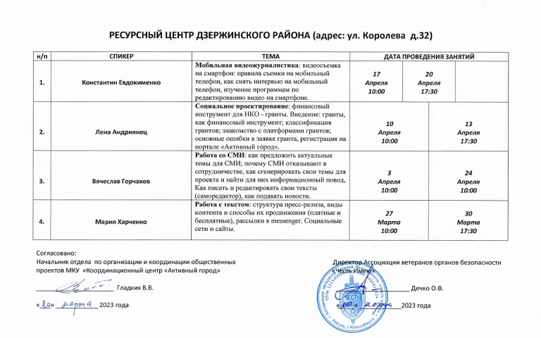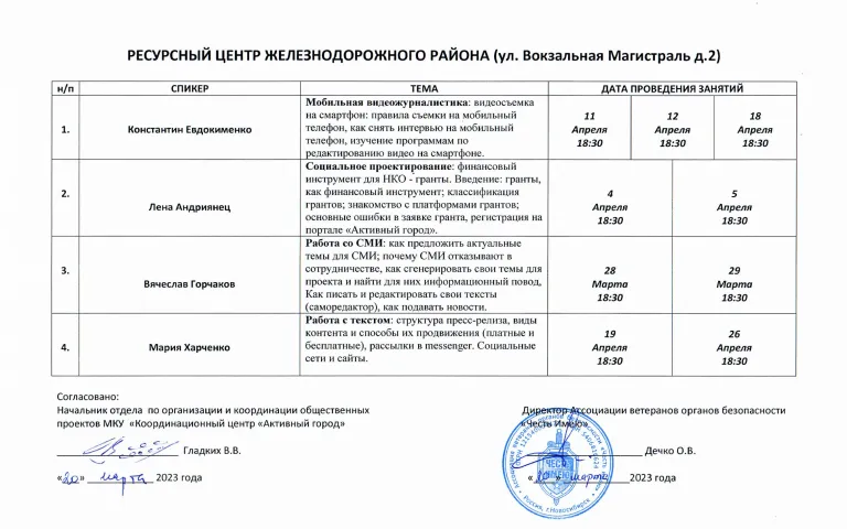 Образовательный курс 1-го этапа проекта был проведен, в рамках программы профессиональной переподготовки, по специальности «Медиаменеджмент» в объеме - 252 часов. По окончании курса слушателями были выданы дипломы о профессиональной переподготовке Государственного образца.