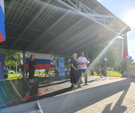 В День российского флага состоялось торжественное открытие сцены после ремонта. Была произведена замена деревянного полового покрытия сцены и выполнена покраска всех элементов.