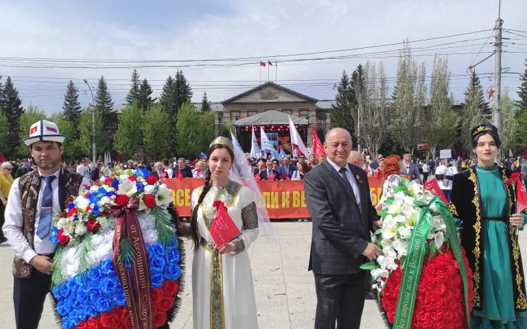 В составе колонны под флагом России и Знаменем Победы к Вечному огню прошли руководители и представители национально-культурных организаций, автономий и землячеств в костюмах своих народов. Городской межнациональный центр подготовил группу молодых активистов, которые включились в шествие в национальных костюмах, изготовленных в рамках гранта Министерства региональной политики Новосибирской области.