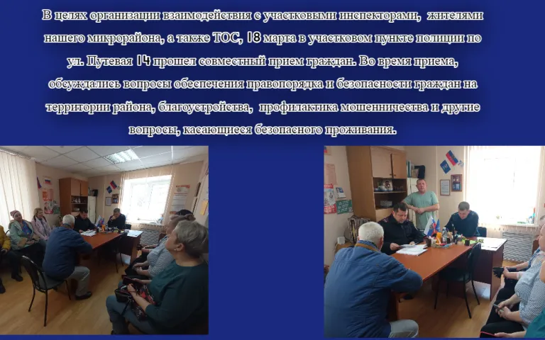 В целях организации взаимодействия с участковыми инспекторами, жителями нашего микрорайона, а также ТОС, 18 марта в участковом пункте полиции по ул. Путевая 14 прошел совместный прием граждан. Во время приема, обсуждались вопросы обеспечения правопорядка и безопасности граждан на территории района, благоустройства, профилактика мошенничества и другие вопросы, касающиеся безопасного проживания.